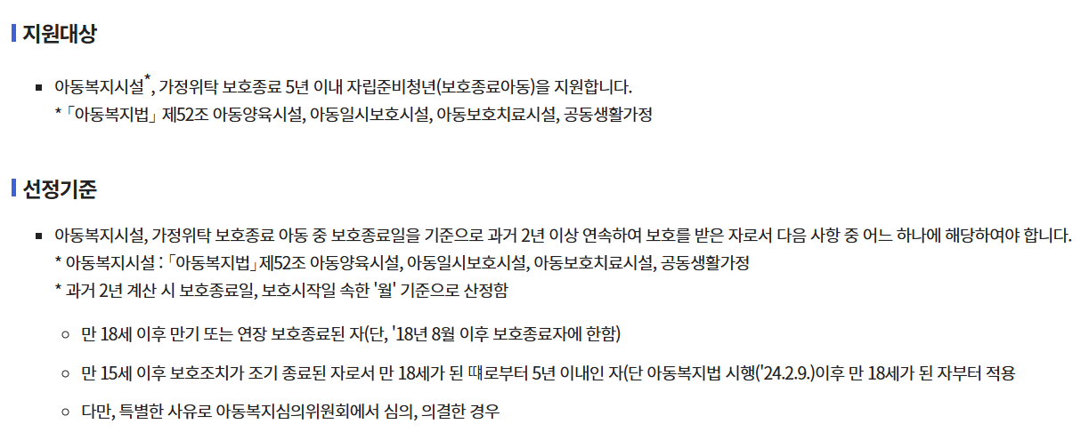 - 지원 대상: 보호시설(청소년쉼터 등)에서 퇴소한 가정 밖 청소년