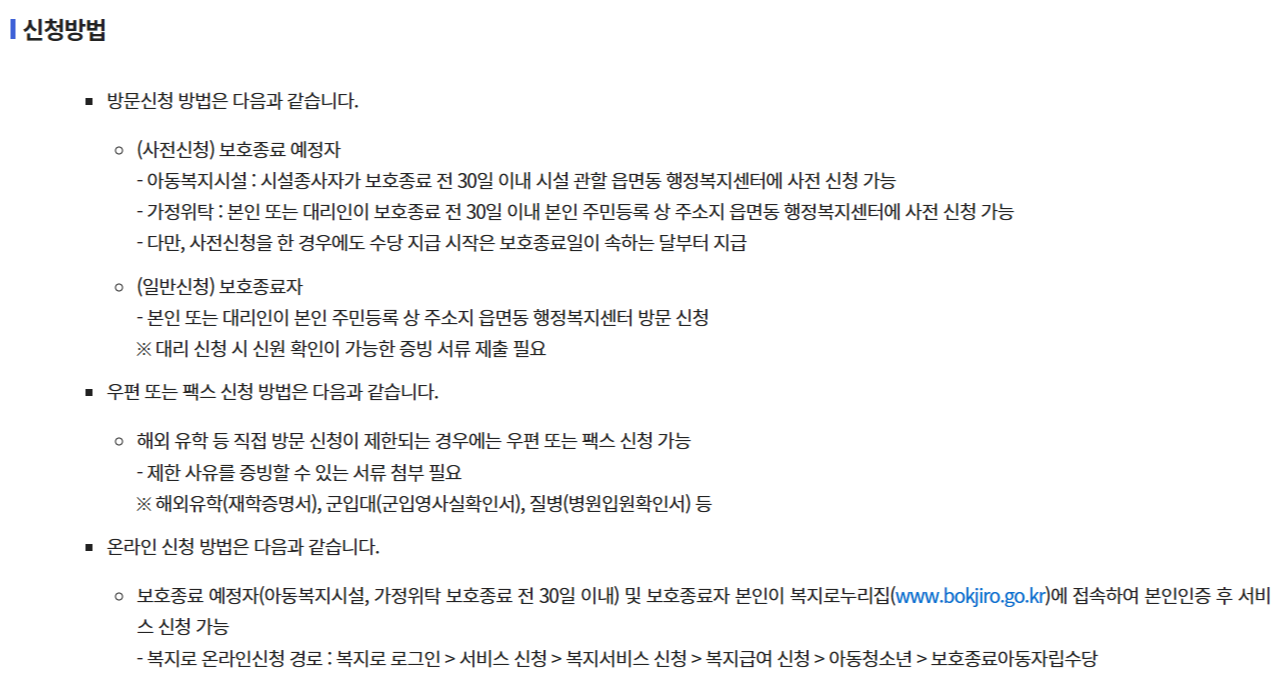 - (사전신청) 아동보호시설 - 시설종사자, 가정위탁 - 본인 또는 대리인이 보호종료 전 30일 이내 시설 관할 또는 본인 주민등록상 주소지 읍면동 행정복지센터 에서 사전 신청 가능 : 수당 지급 시작은 보호종료일이 속하는 달부터 지급함