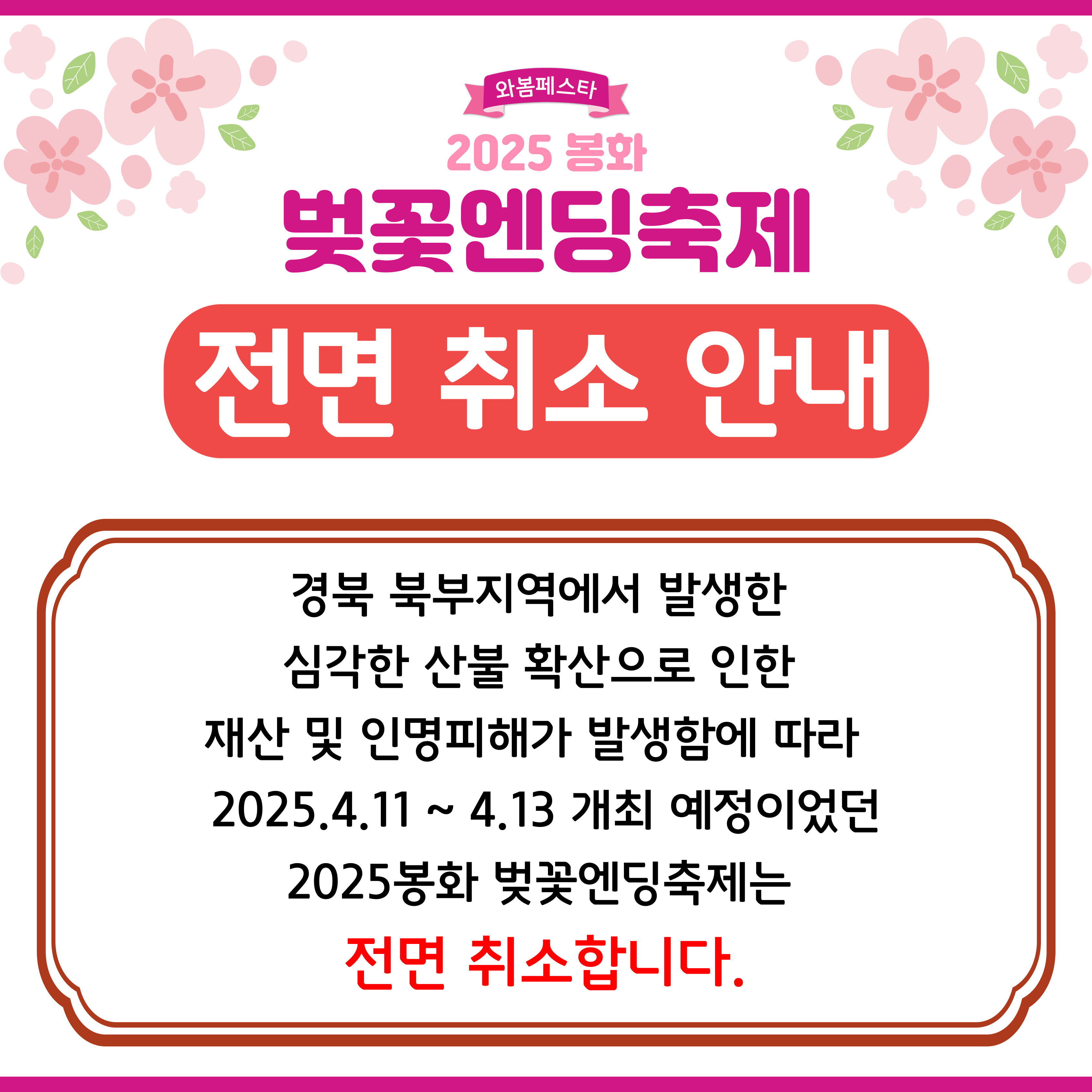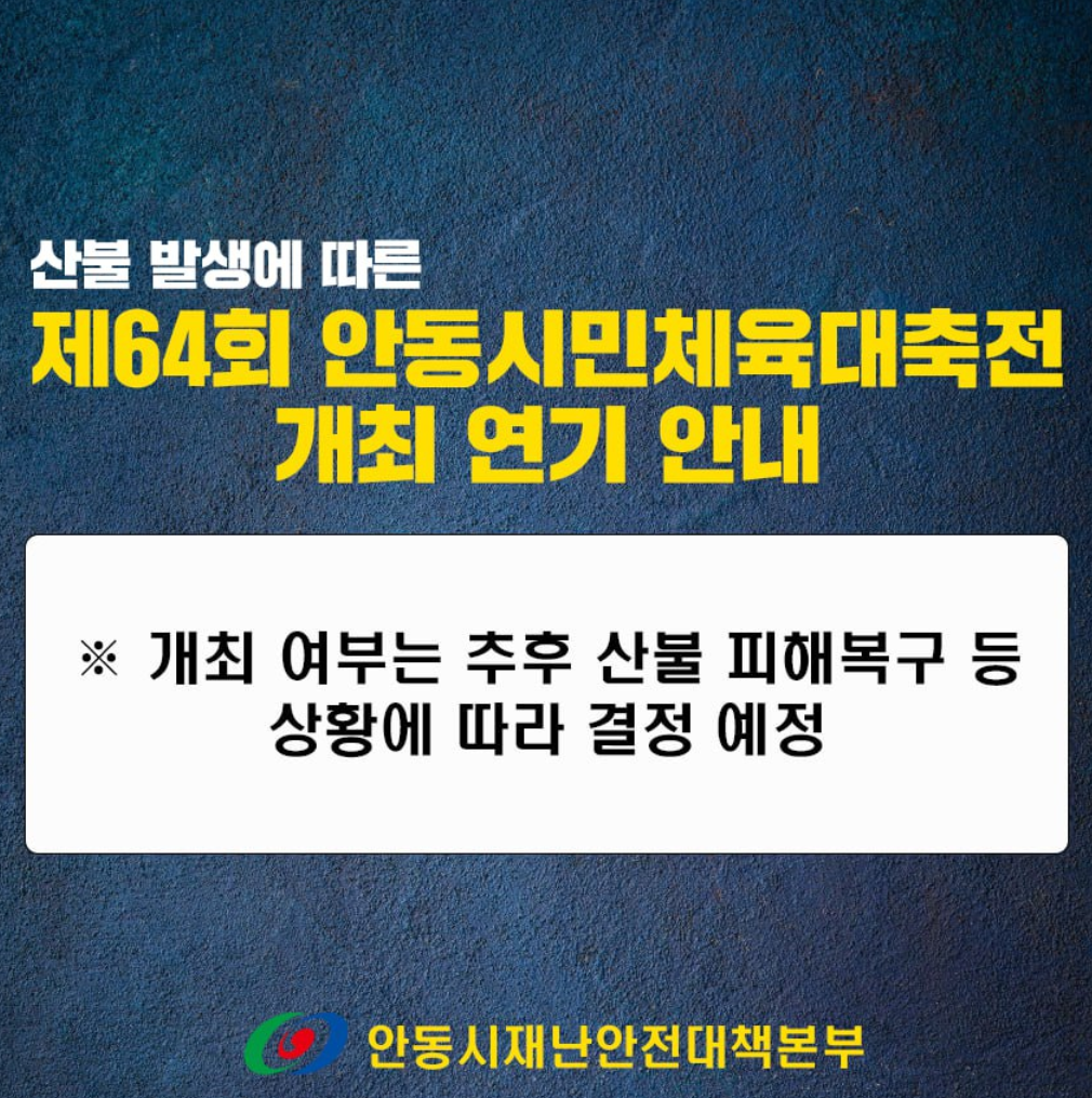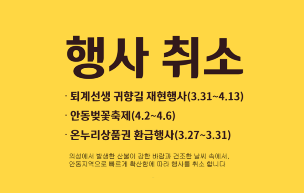 대형 사상자와 주택, 문화재 피해를 낸 경북 산불의 희생자들을 애도하고 추모하기 위해 계획되어있던 다수의 축제 · 행사가 취소되거나 연기, 축소 운영됨을 알려드립니다.