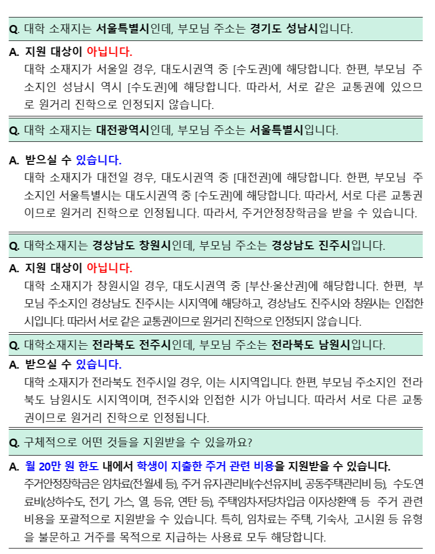 - 학생이 다니는 대학 소재지와 부모의 주민등록상 주소지가 서로 다른 교통권일 경우 원거리 인정