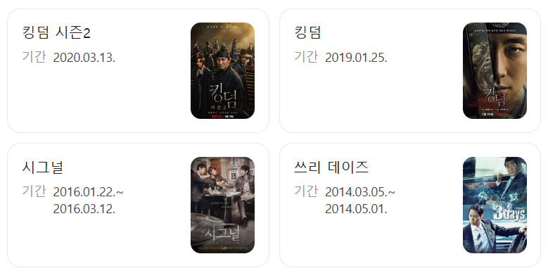 - 킹덤 시즌 1, 2 (2019, 2020, 넷플릭스) – 조선 시대 좀비물