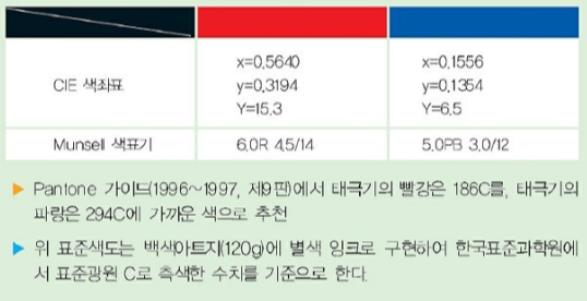 - 태극기의 표준색도는 펜톤 가이드(1996-1997 제9판)에서 빨강은 186C, 파랑은 294C를 기준으로 함