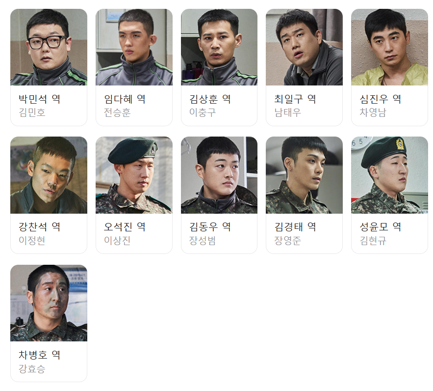 | 강찬석 | 이정현 | 부대 내 각종 사건사고를 일으키는 악마, 후임들을 많이 괴롭힘. |