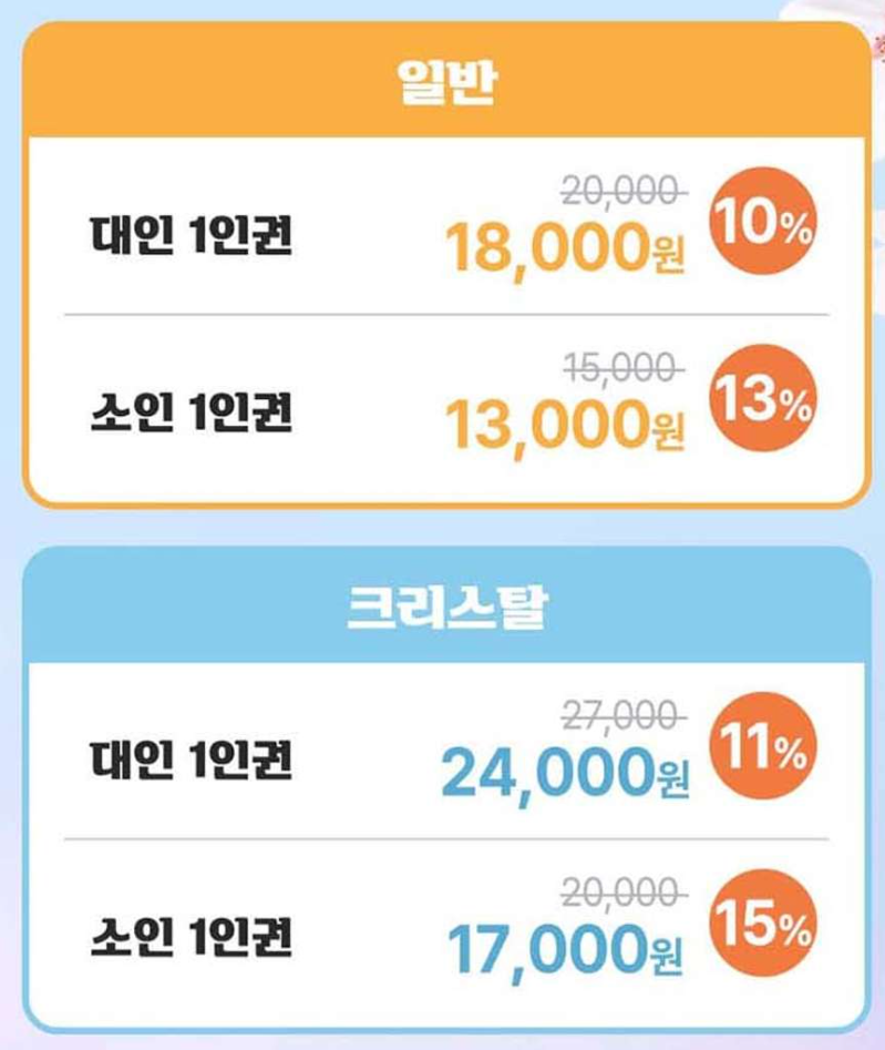 | [한시 할인] ▷ 육군 8962부대 : 전장병 5천원할인(본인포함 최대 6명) : 2025-02-28 ~ 2026-02-28 ▷ 공군 8357부대 : 자세한 사항은 대표번호 또는 매표소 문의 : 2024-02-11 ~ 2026-12-31 |