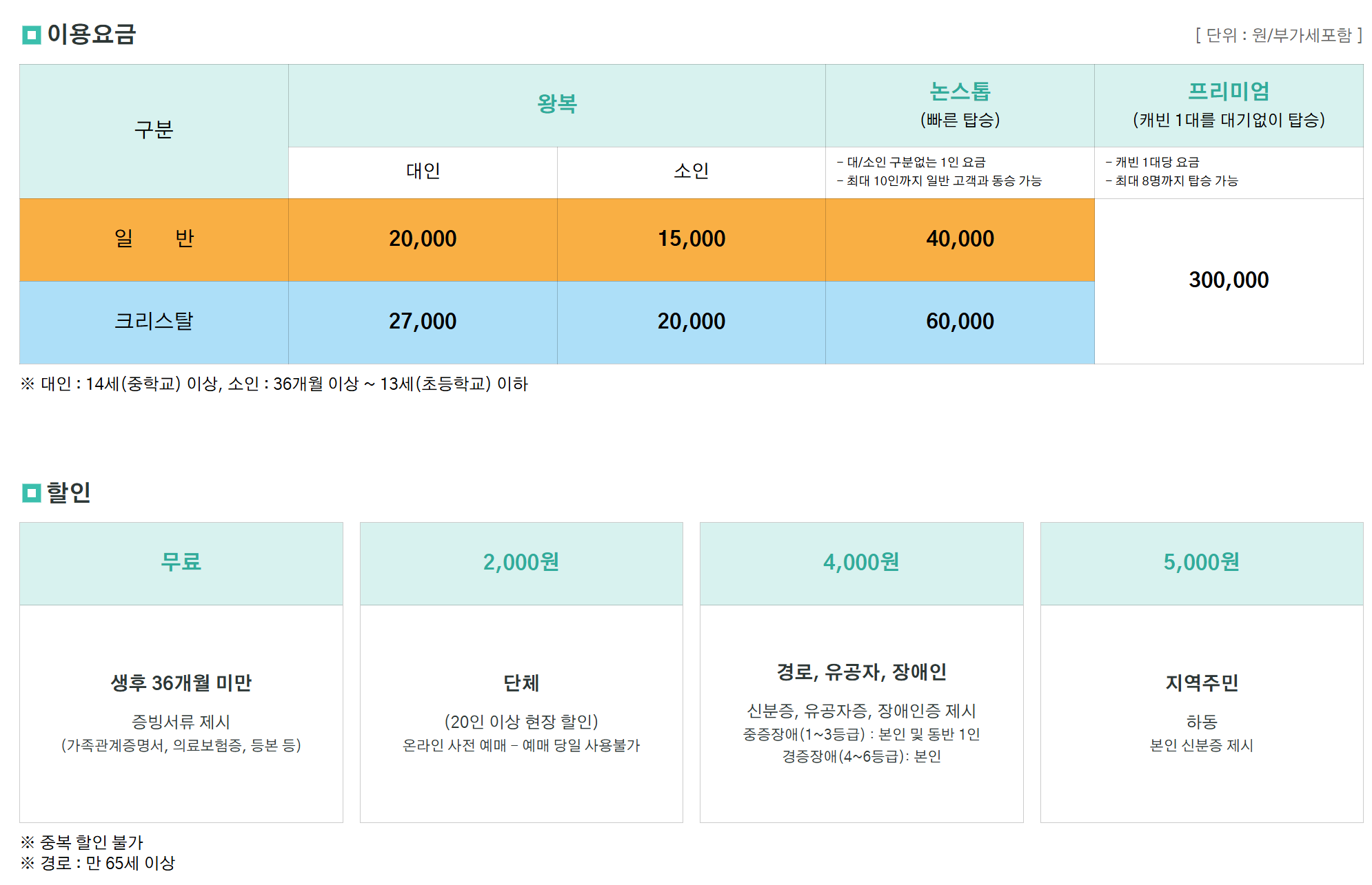 | 대인 | 소인 | - 대/소인 구분없는 1인 요금 - 최대 10인까지 일반 고객과 동승가능 |