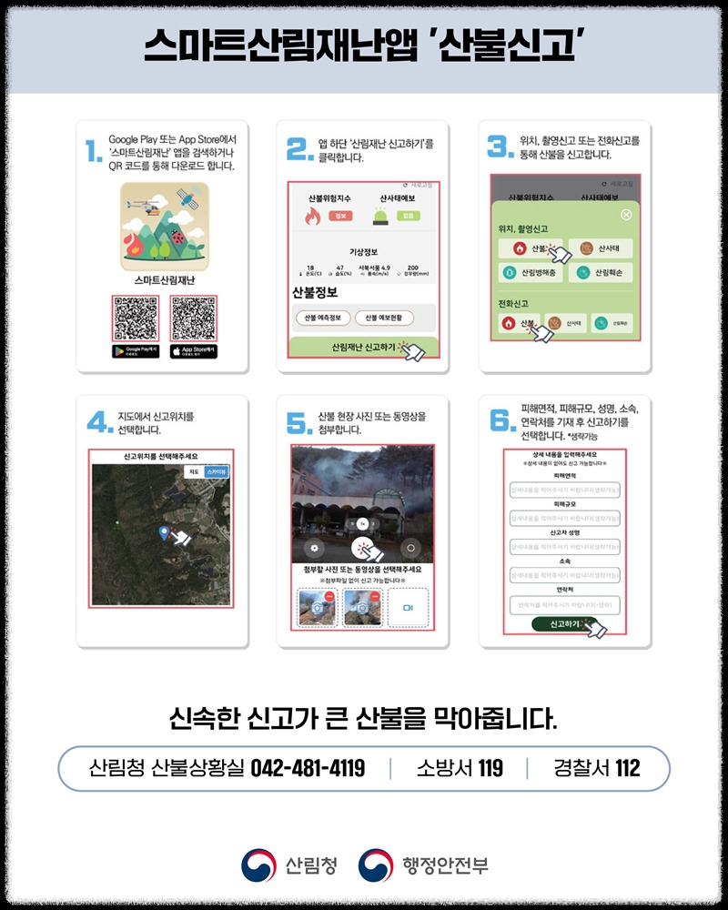 - 전화신고 외에 스마트 산림 재난앱 '산불신고'에서도 신고위치, 사진, 동영상 등 첨부하여 신고가 가능합니다.