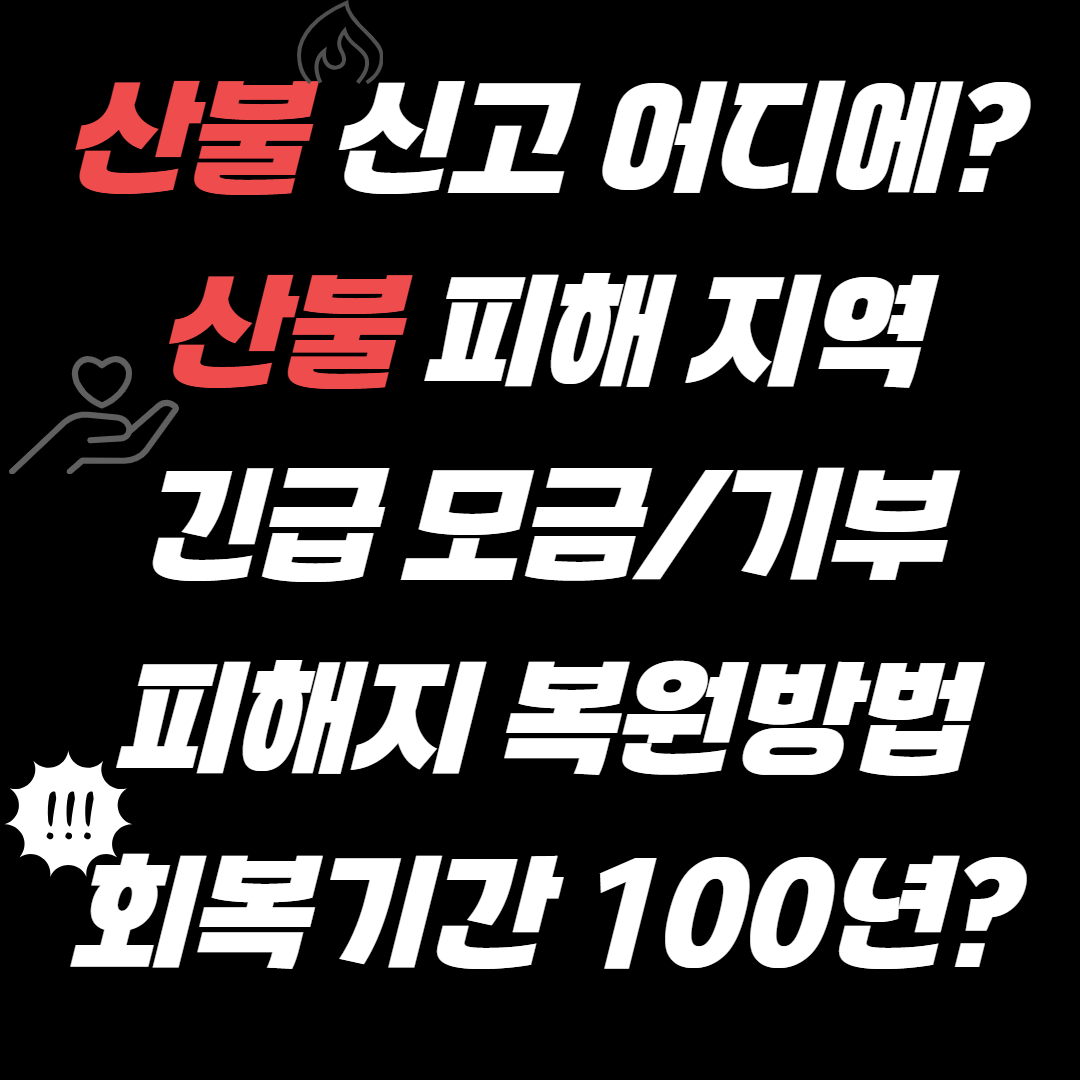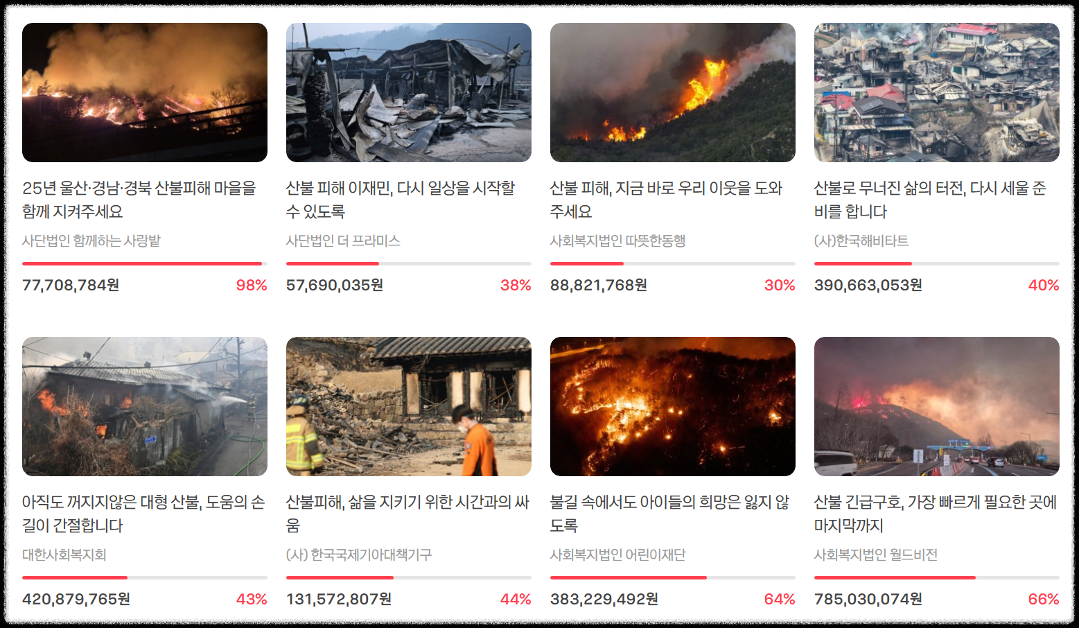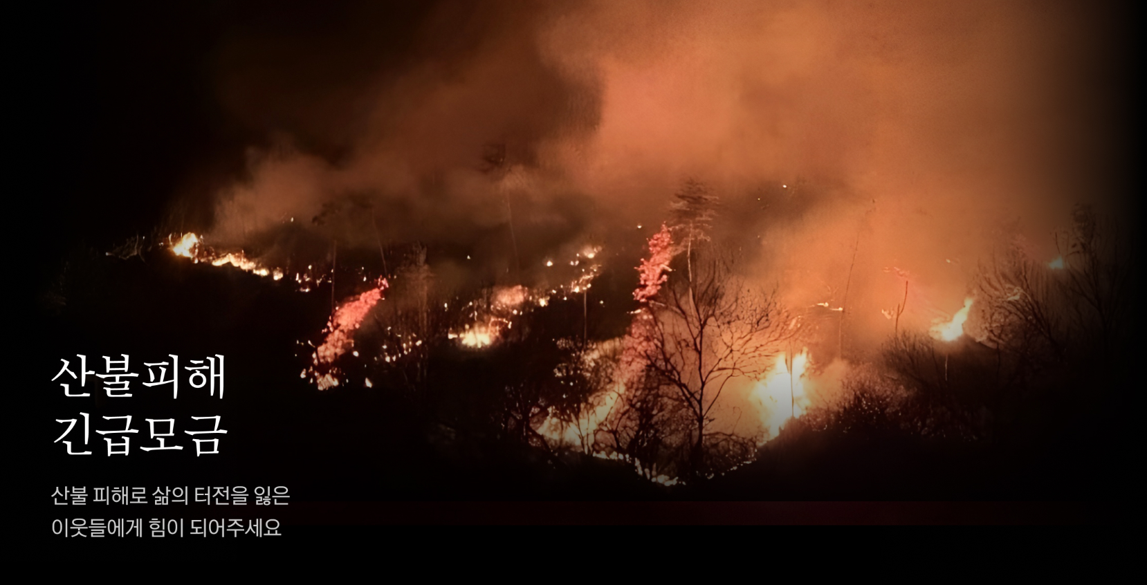 현재 다양한 기업과 연예인 등이 산불 피해 지역 복구에 기부하고 있으며, 피해지역을 걱정하는 타 지역 국민들 또한 긴급 모금에 기부 및 후원을 하고 있습니다. 계속적으로 산불피해 입으신 분들을 위한 기부행렬이 이어지고 있습니다.