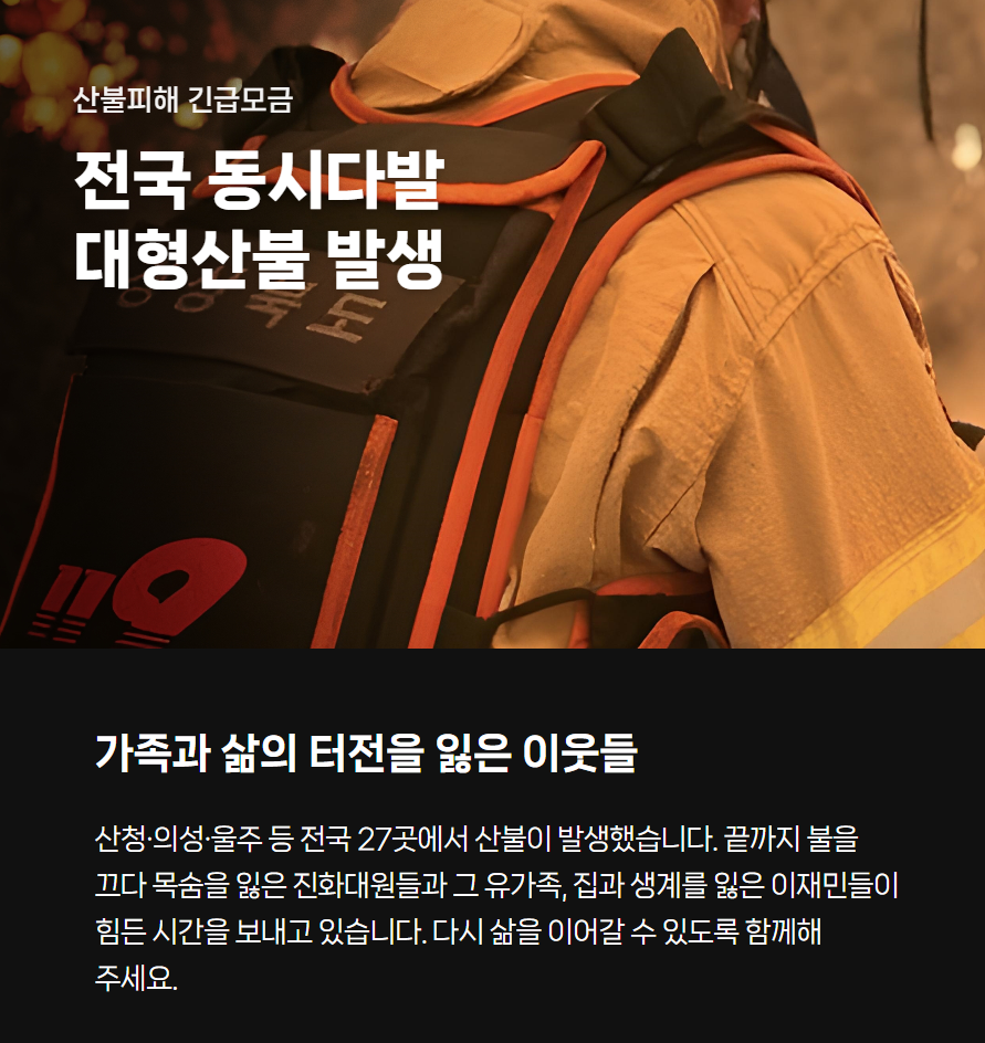 티끌모아 태산이라는 말이 있듯이 아주 작은 금액이라 망설이지 말고 아주 작은 금액이"라도" 기부를 하게 되면 산불 피해 주민들에게는 꼭 도움이 될 것이라 생각합니다.