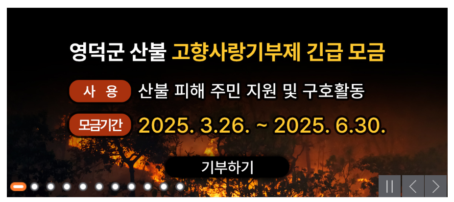 - 현재 영덕군은 지자체에서 고향사랑기부제로 긴급 모금 중이며 기부된 금액으로 산불 피해를 입은 영덕 주민 구호활동, 피해복구에 사용될 예정입니다.