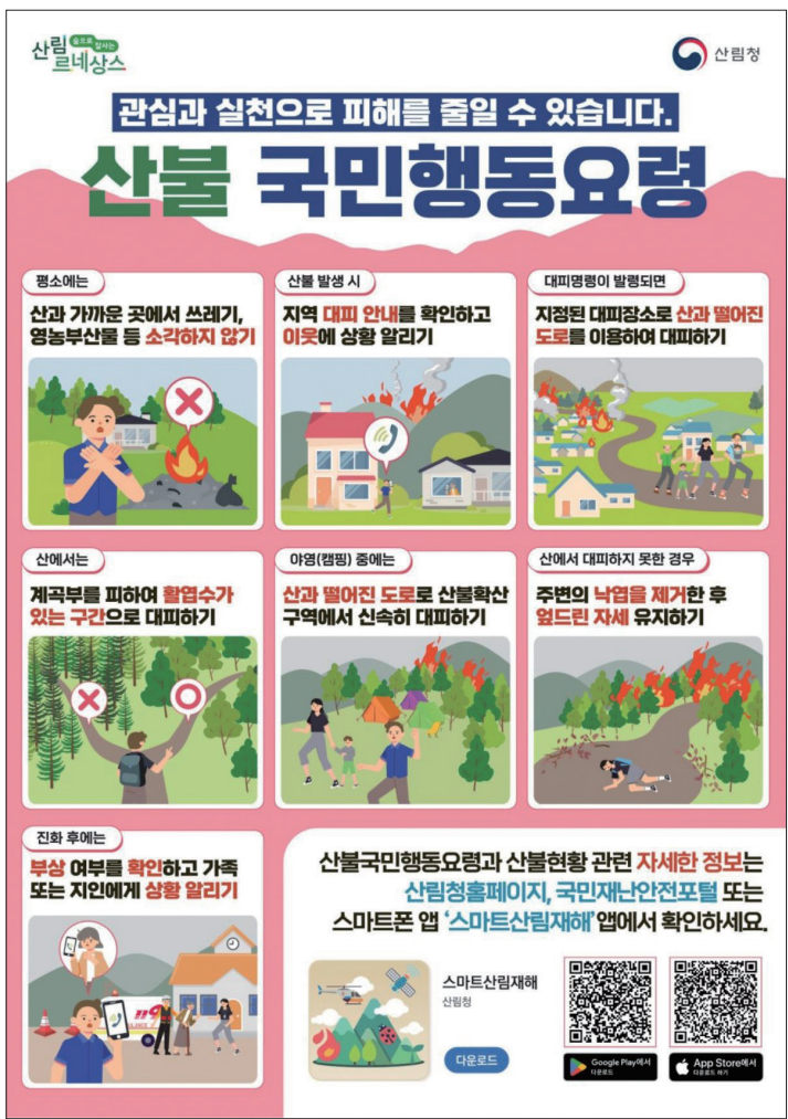 이번 기회에 산불 국민행동요령에 대해 정확하게 숙지하여 자연을 위해, 우리 아이들을 위해, 평범한 삶을 위해 (앞으로 발생하지 않아야 할) 산불 피해를 최소화하는데 우리 모두 노력해야 할 것입니다.