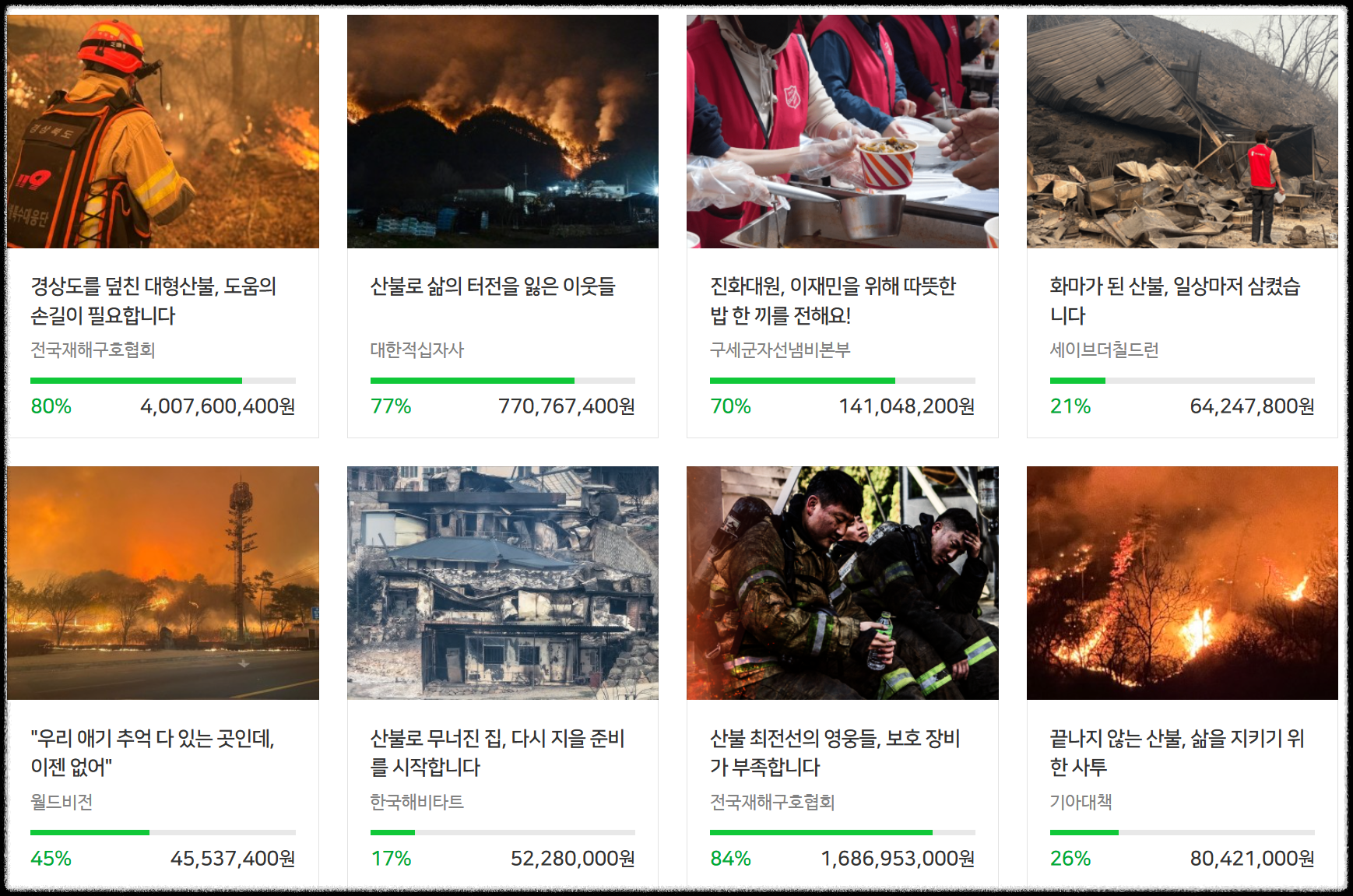 - [네이버] 다양한 여러 단체에서 긴급 모금을 하고 있으며 기부하고 싶은 곳을 선택하여 기부