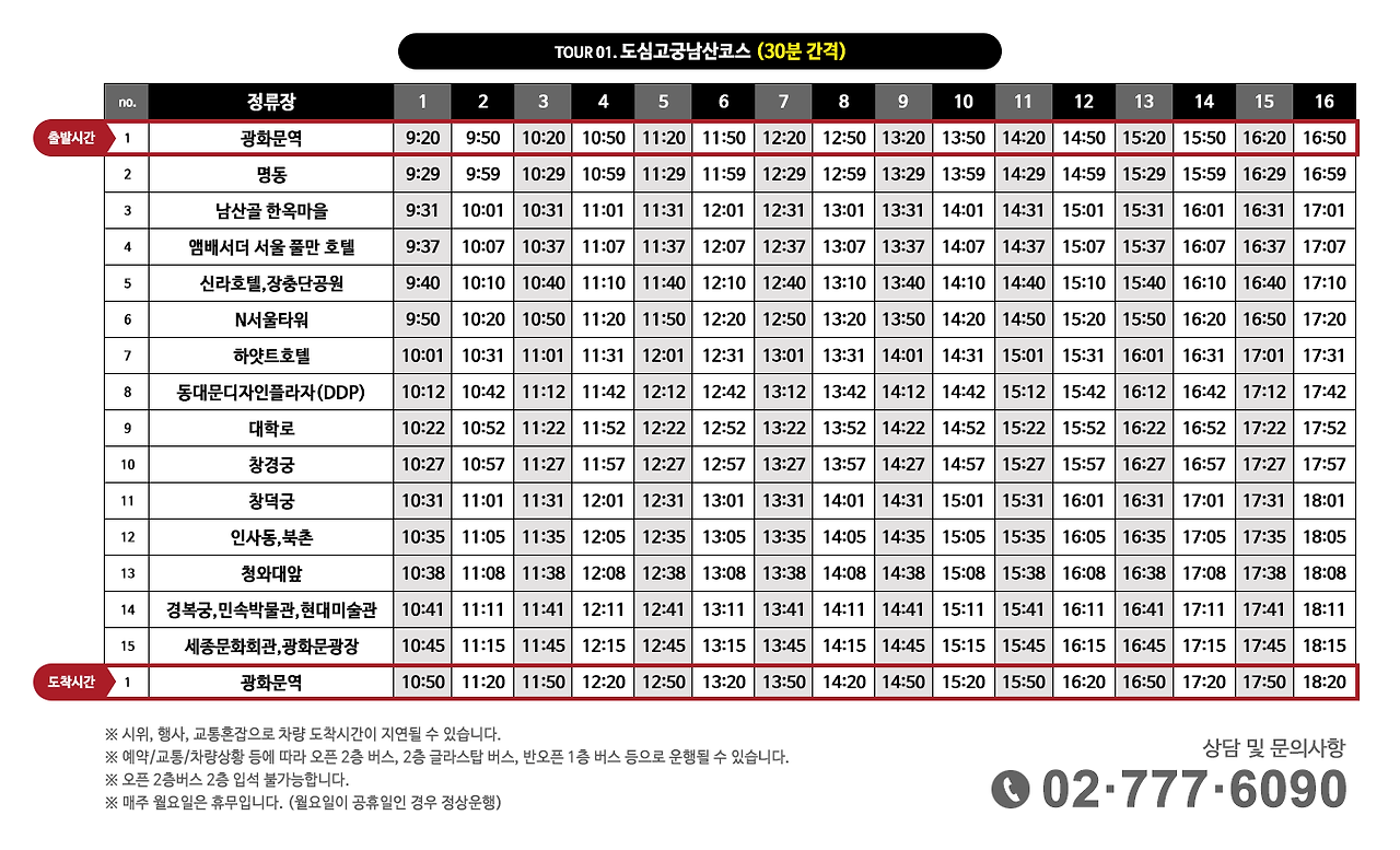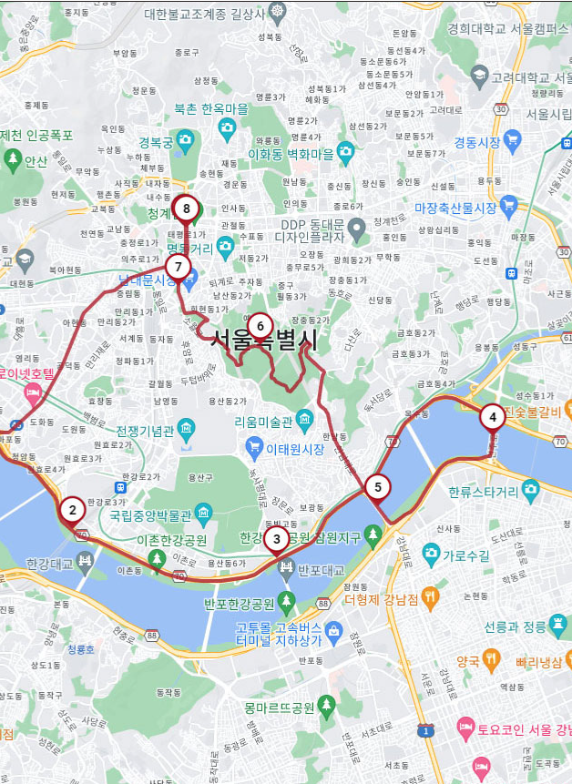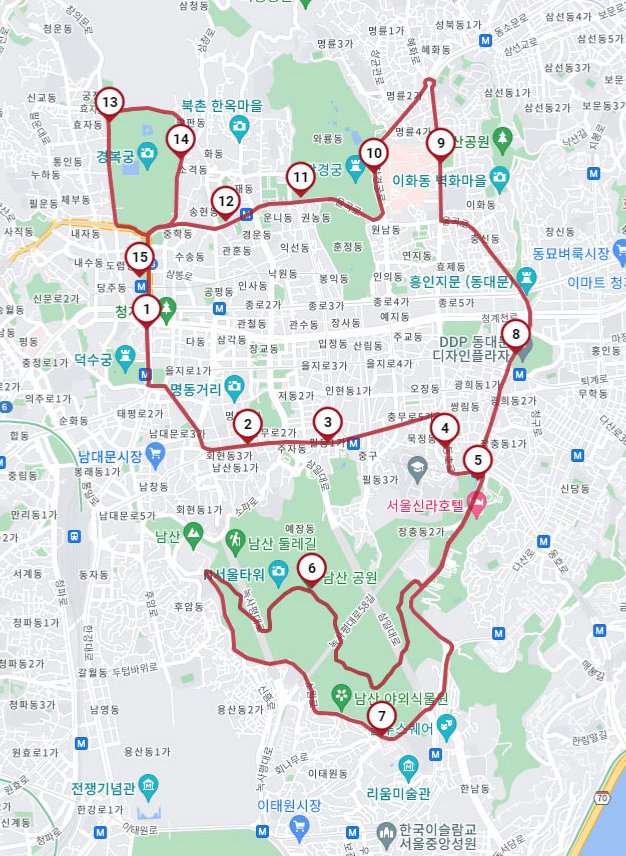 | 광화문역 - 명동 - 남산골 한옥마을 - 엠베서더 서울 풀만 호텔 - 신라호텔, 장충단공원 - N서울타워 - 하얏트호텔 - 동대문디자인플라자(DDP) - 대학로 - 창경궁 - 창덕궁 - 인사동, 북촌 - 청와대앞 - 경복궁, 민속박물관, 현대미술관 - 세종문화회관, 광화문광장 - 광화문역 |