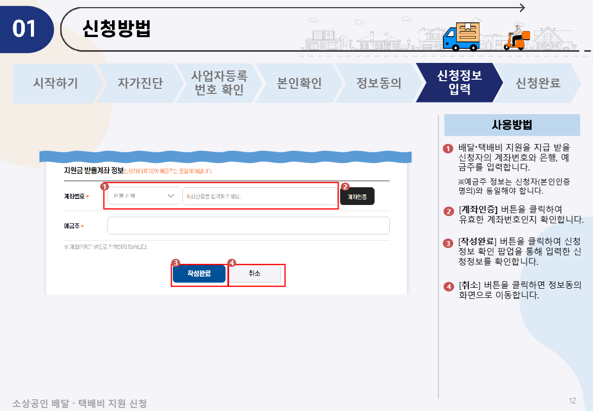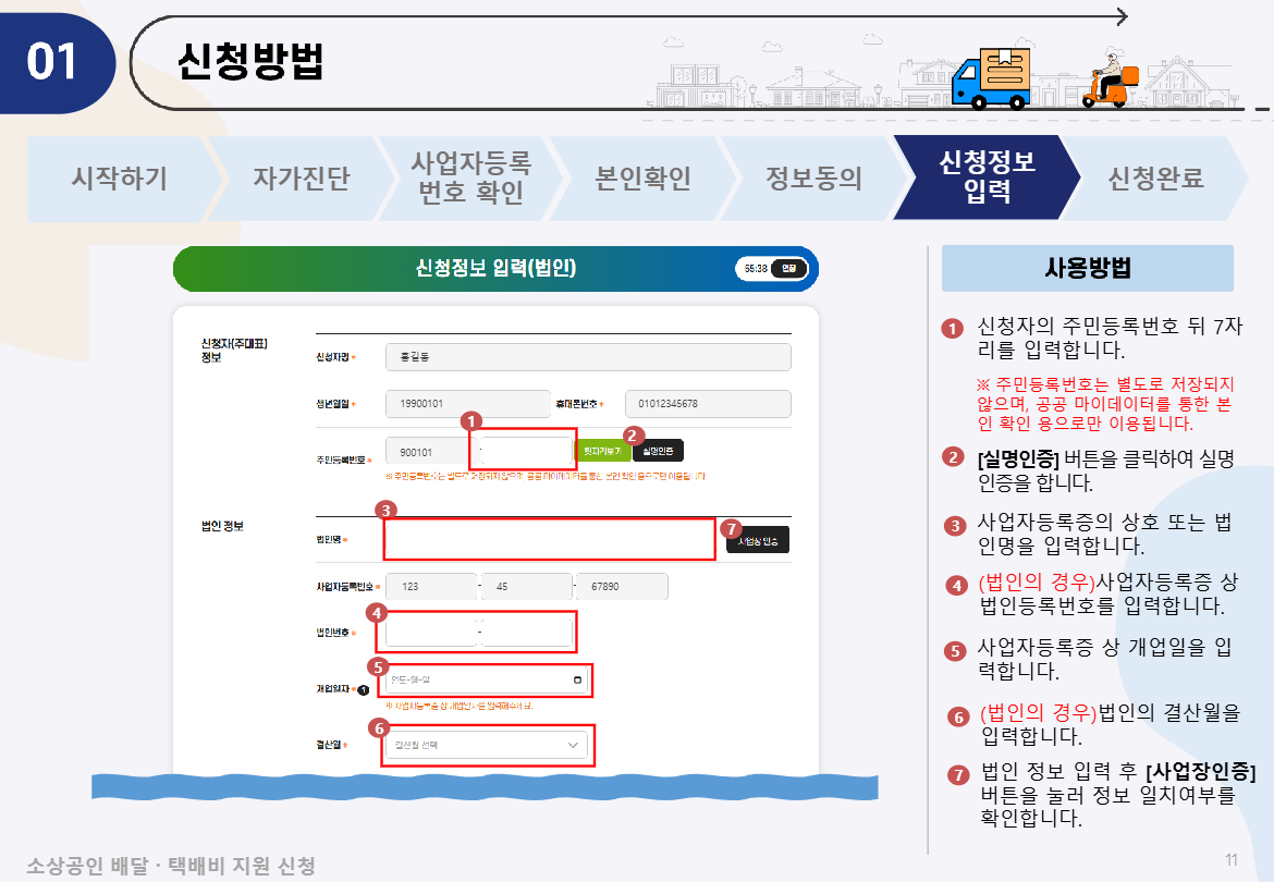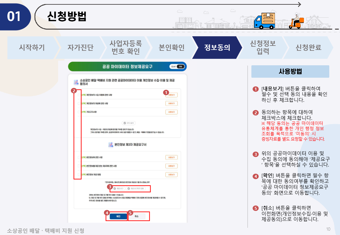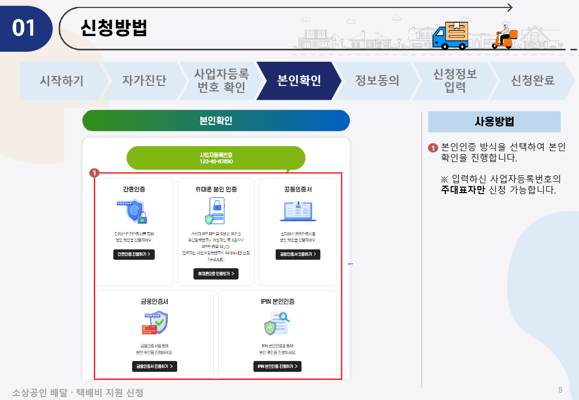 - 신청 시작하기 - 자가진단 - 사업자등록번호확인 - 본인확인 - 정보동의 - 신청정보 입력 - 신청완료