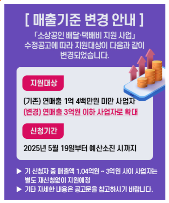 - 국세청 부가세 신고매출액 또는 면세사업자 사업장현황신고 기준 연 매출액 0원 초과 ~ 3억원 이하 사업자를 대상으로 함 (2025년 5월 19일 연매출요건 완화로 수정공고)