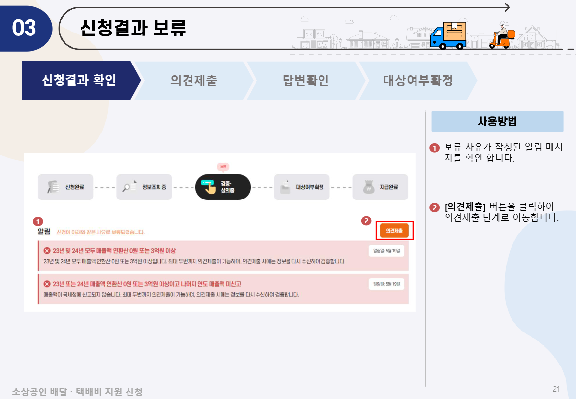 - 신청 후 신청결과 보류가 되는 경우 의견 제출로 소명하기