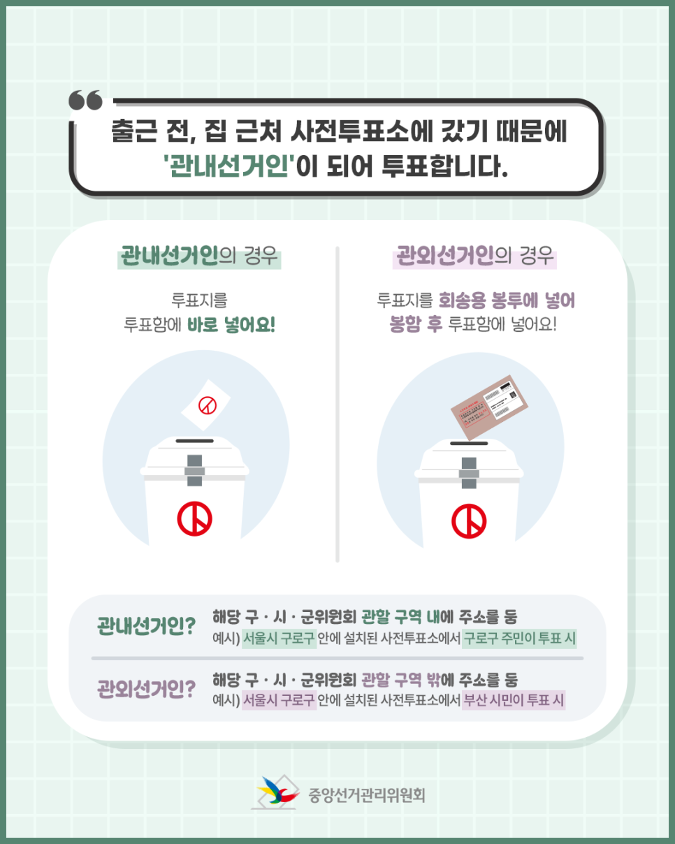 관내 선거인 : 집 근처 사전투표소 '관내선거인' - 투표 후 투표함에 바로 넣기