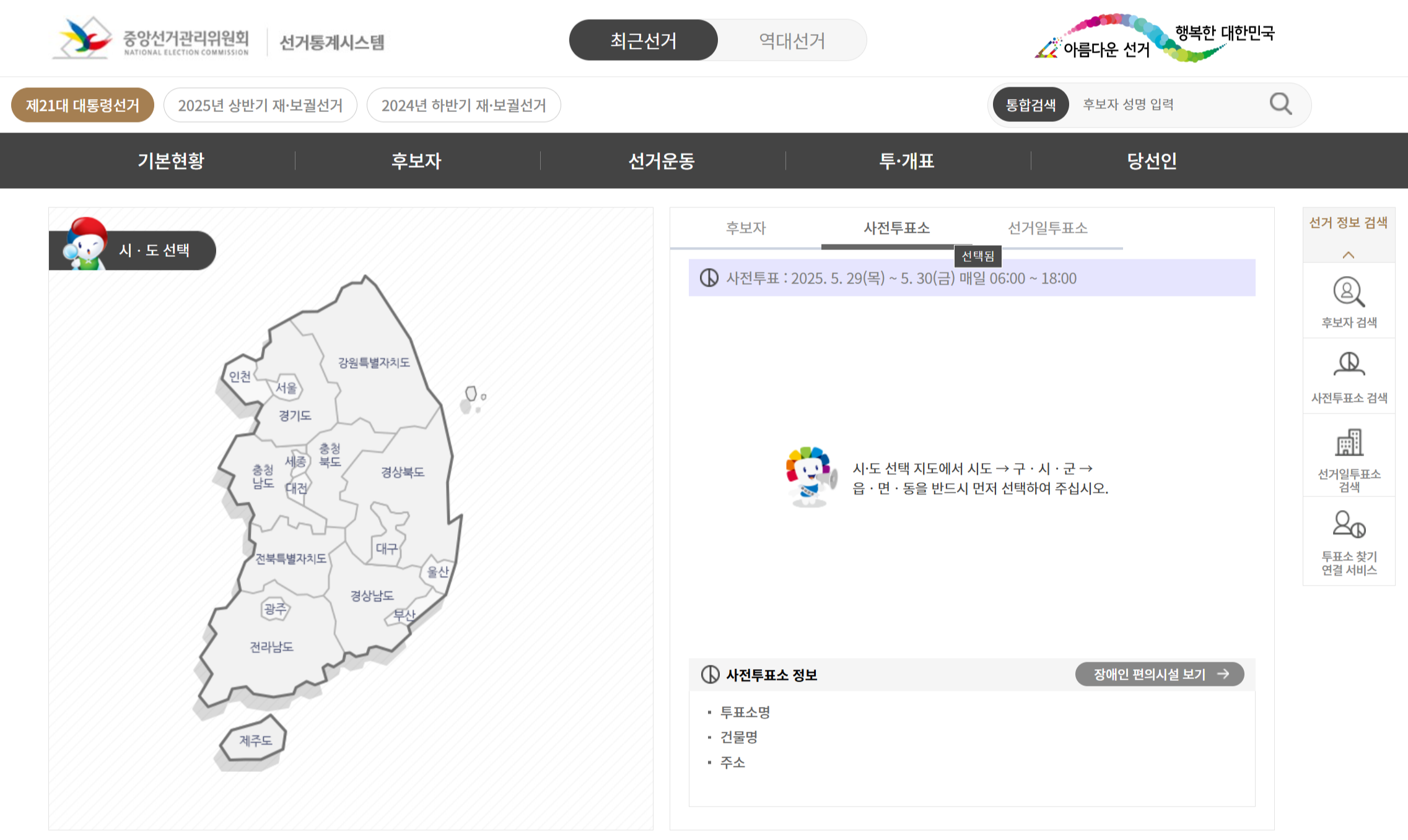 3-2) 중앙선거관리위원회 선거통계시스템 접속화면 - 사전투표소 선택
