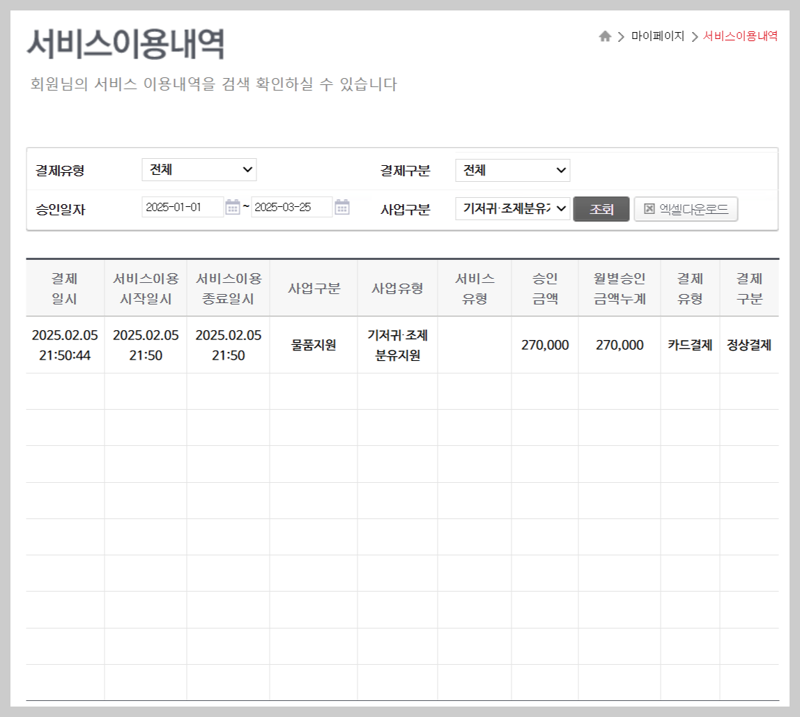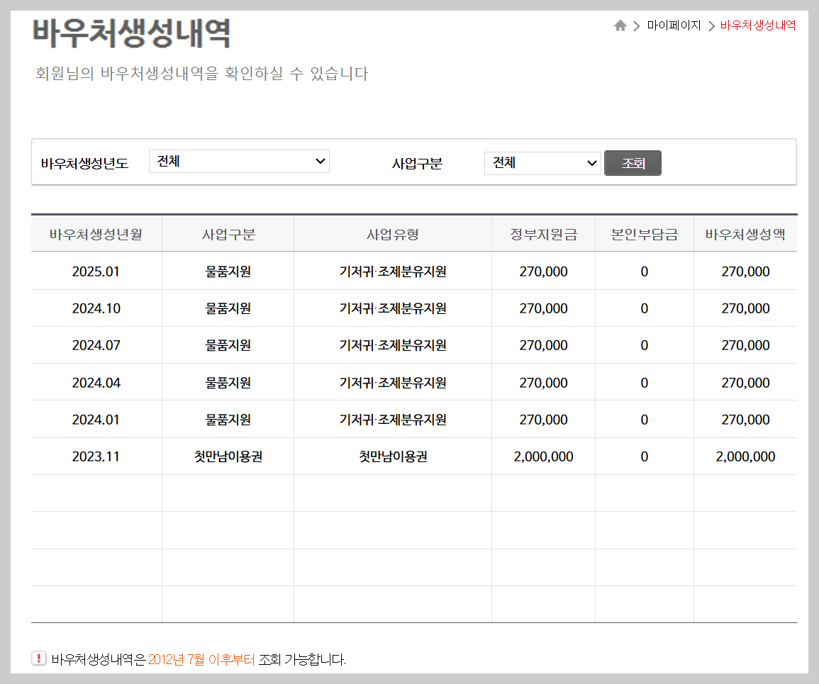 - 마이페이지 - 서비스 이용내역 - 승인일자(3개월 단위로 조회) - 사업구분 : 기저귀 조제분유 바우처 - 조회