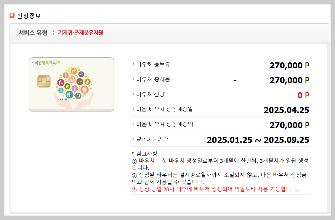 - 출생일로부터 0~24개월까지 지원 가능 (3개월 주기로 지원금 생성)