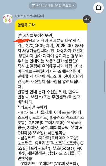 카카오톡 알림에 자격이 중지되는 경우 바우처는 안내되는 사용기간과 상관없이 즉시 소멸된다고 나와있으나, 즉시 소멸되지 않고 생성된 바우처를 사용할 수 있는 기간이 있습니다. 너무 겁먹지 마세요!