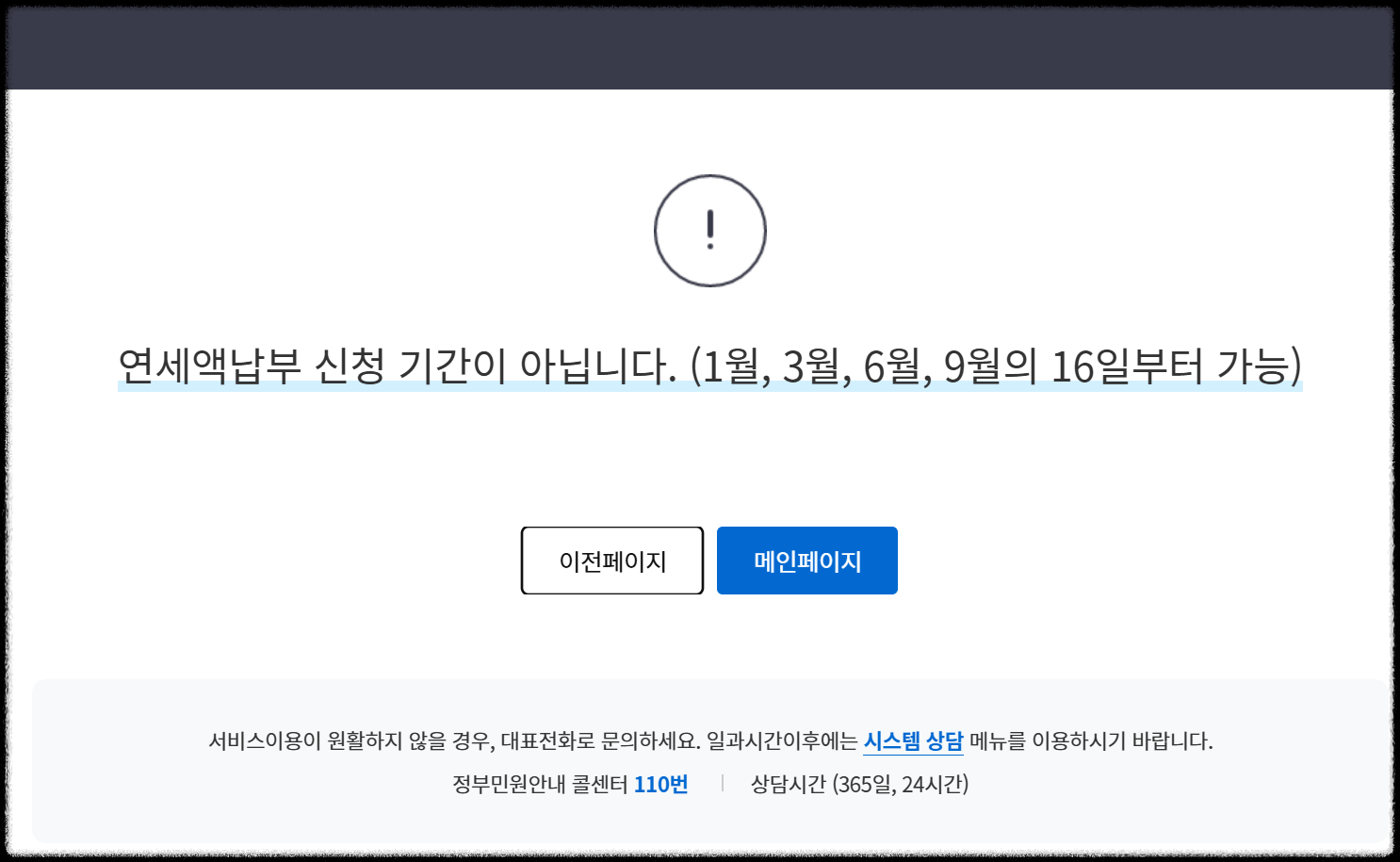 - 현재(2025.4.1) 위택스 자동차세 연세액 납부 신청 클릭 시 아래와 같이 연세액 납부기간이 아니라는 팝업이 뜨게 됩니다.