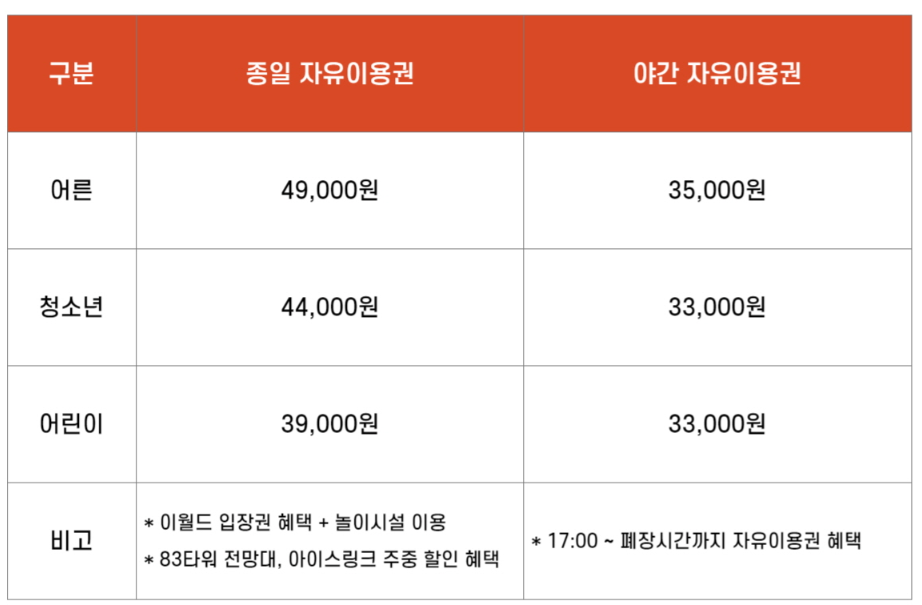 종일 자유이용권 대인 - 49,000원 / 청소년 - 44,000원 / 어린이 - 39,000원
