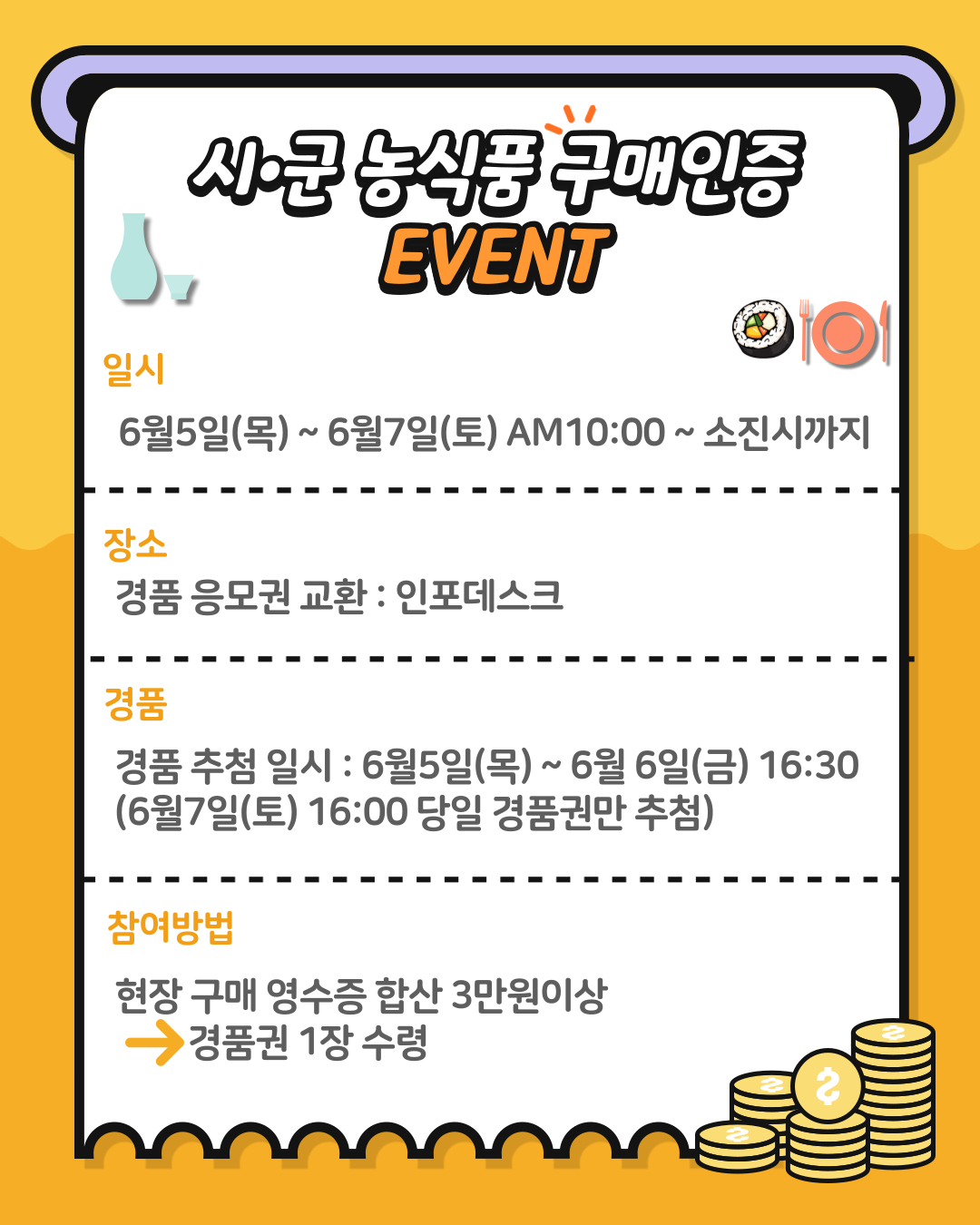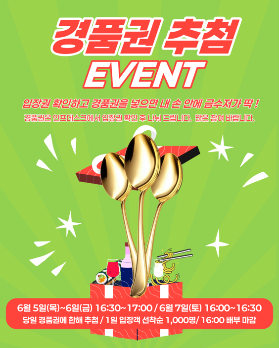 - 경품권 추첨일시 : 6월 5일(목) ~ 6일(금) 14:30~17:00 / 6월 7일(토) 16:00~16:30