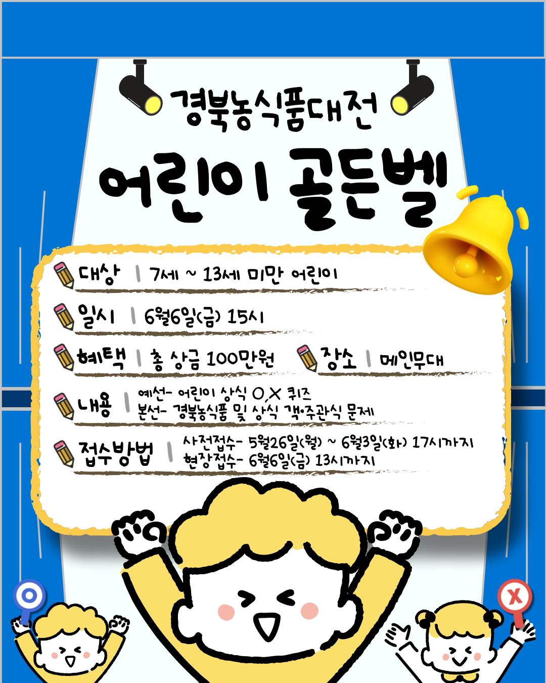 - 내 용 : 예선 - 어린이 상식 O,X 퀴즈 / 본선 - 경북 농식품 및 상식 객관식, 주관식 문제