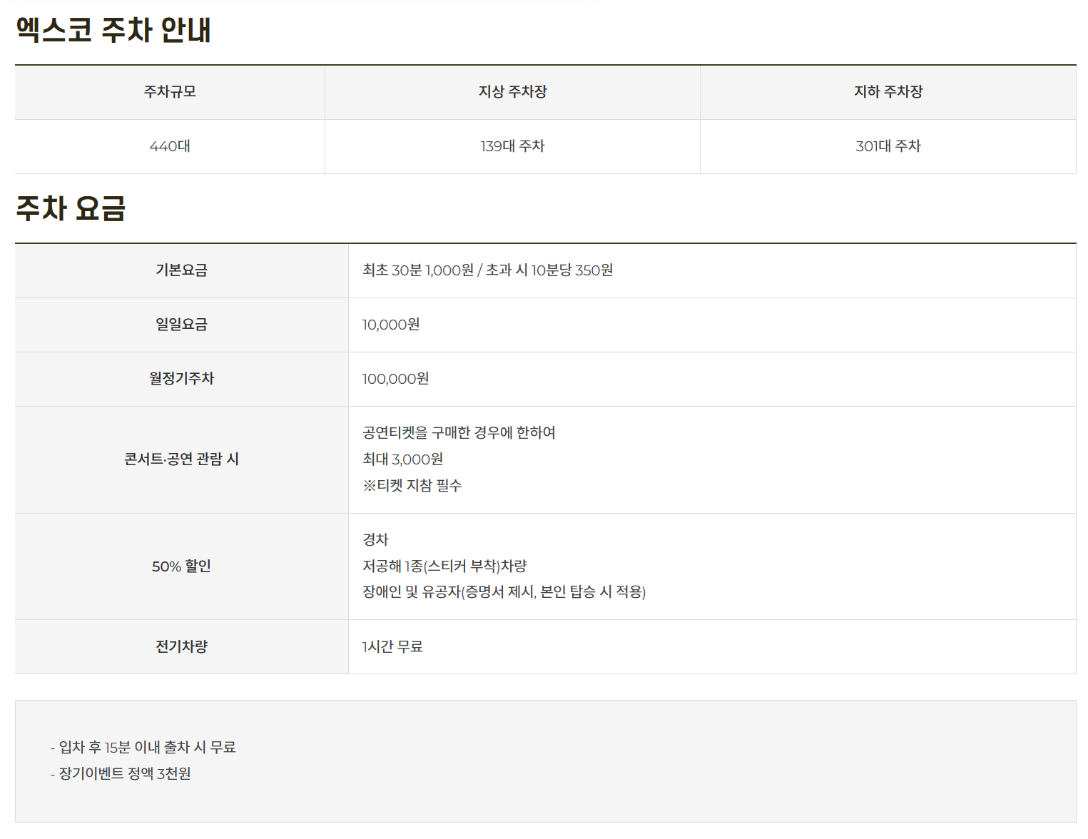 - 주차요금 : 최초 30분 1,000원 / 초과시 10분당 350원 / 일일 최대 10,000원