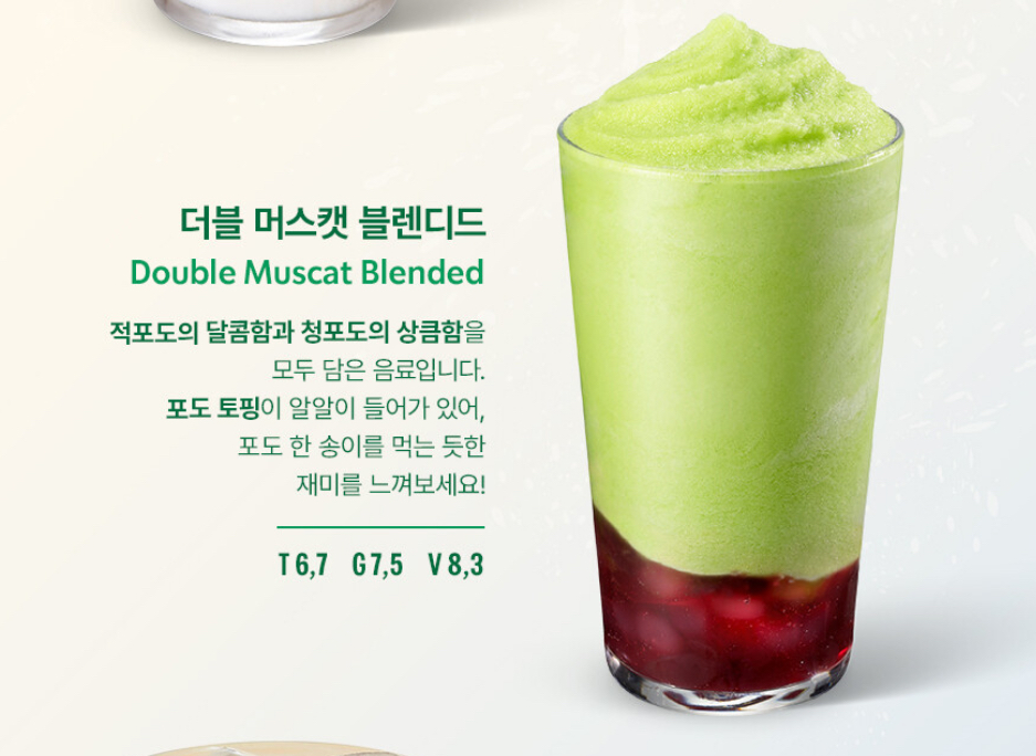 - 음료 설명 : 적포도의 달콤함과 청포도의 상큼함을 모두 담은 블렌디드 포도 토핑이 알알이 들어가 있어 포도 한송이를 먹는 듯한 재미를 느낄 수 있은 음료