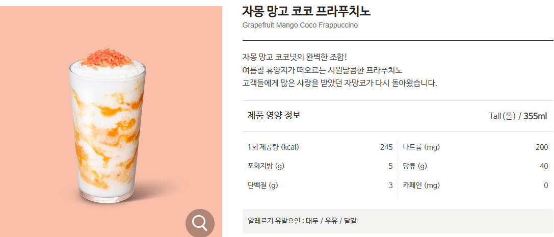 - 음료 설명 : 자몽 망고 코코넛의 완벽한 조합! 여름철 휴양지가 떠오르는 시원달콤한 프라푸치노 고객들에게 많은 사랑을 받았던 자망코가 다시 돌아왔습니다.