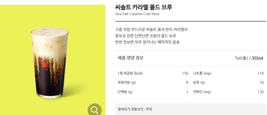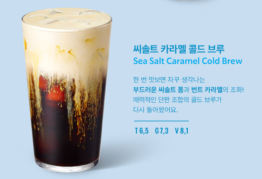 - 음료 설명 : 구름 처럼 부드러운 씨솔트 폼과 번트 카라멜의 중독성 강한 단짠단짠 조합의 콜드 브루 한번 맛보면 자꾸 생각나는 매력적인 음료